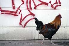 Chicken marking graffiti on an abandoned building in Harrisburg. Well, not really.